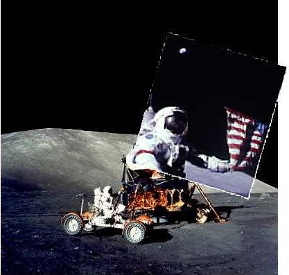 Fig. 3 shows a more defensible superimposition. We are able to identify certain prominent features in the South Massif and use them as registration aids. Further, we make use of the entire inset frame. The combination of the correlations identified in the caption strongly suggests that this is a more accurate registration of these photos. All visible elements of the ridgeline and the foreground demarcation line up. Since features (A) and both features (B) form a triangle, it is impossible for there to be more than one such correlation. Further, both features (B) and feature (C) -- which by itself provides both collocation and slope -- form a second triangle that establishes a single registrational solution. There is a high degree of confidence in this superimposition. The portion of the rotated photograph (AS17-134-20387) that contains the image of the earth is now outside the frame of the photo containing the LM and LRV, confirming that the earth image should not appear in that photograph, and that this does not constitute a point of inconsistency between them. Mr. White has had similar problems normalizing the scale of Apollo photographs he compares directly. |