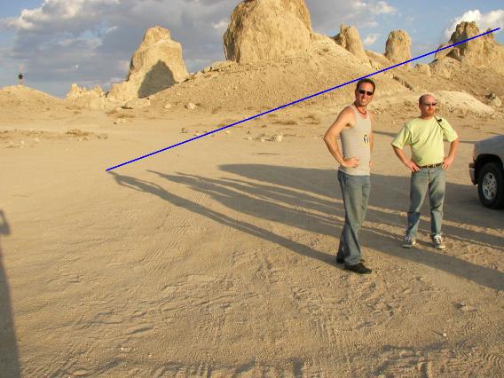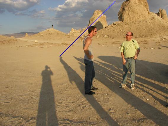 According to the conspiracists' line of reasoning, the "sun angle" in Fig. 2 should be about 45° (as measured from the image horizontal). But by Fig. 4 -- just by changing the photographer's position -- the "sun angle" has decreased to less than 30° (as measured the same way). If differences in "sun angle" as great as 15° can be shown simply by changing the photographer's position, then this isn't a very good method of determining the sun's elevation angle. And in fact real photo analysts know that you can't determine the sun's elevation by this method, precisely because the effect of perspective has to be taken into account. A method called "vanishing point analysis" exists to determine the