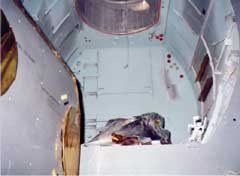 The forward hatch occupied the middle segment of the front wall of the cabin (Fig. 2), beneath the center instrument panel. The commander normally stood to its left and the lunar module pilot (LMP) stood to the right. After donning their suits and PLSSes, the pressure was bled away into space and the LMP opened the door. It was hinged on his side, so he had to crowd toward his side of the cabin and hold the door open against his legs. The commander would then turn round, get down on his hands and knees, and back out onto the porch. After he had gone down the ladder, the LMP could close the door, move to the commander's side of the cabin, open the door again, and repeat the commander's procedure.