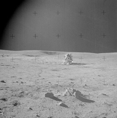 Conspiracists also say that photos like Fig. 3 cannot have been taken with only one light source because they interpret the shading and shadow on the astronaut to mean that light must be coming from multiple directions. They claim the good lighting on the shaded parts of objects, and on objects fully in shadow, can only be explained by the use of supplementary lighting (called "fill lighting" in photography lighting terminology). And since there was no explicit fill lighting techniques or equipment used on Apollo missions, conspiracists once again say the observed effects in the photo are inconsistent with the circumstances under which NASA says they were taken. The myth tested here is, "Where light comes from only one source in one direction, then surfaces that aren't directly lit must appear very dark." That too can be tested in a studio by scale models and studio lights. Lighting designers and photographers know that surfaces reflect light. Hence a study of "global" illumination effects from one light and its incidental reflections on objects in a scene only has to replicate the optical properties of the materials and their relative distances in order to be scientifically accurate. The strength of the light can be adjusted by varying its distance and its luminosity. The Mythbusters took great pains to achieve the proper reflectivity of the lunar surface and the space suit. Jamie is shown measuring the geometric albedo of his simulated lunar surface in exactly the same way astrophysicists measure the actual albedo of the real lunar surface: in the exact opposite direction from the direction at which the light arrives. We suspect that the light reflected from the lunar surface on either side of the lunar module's shadow provides the fill light for this scene. The Mythbusters set up a geometrically equivalent scene, made the reflectivity values also equivalent to the objects in the photo, and arranged scrupulously for only one source of light to illuminate the scene. Their photographs show proportionally similar lighting levels to the "impossible" Apollo photograph, proving that the ordinary objects in the scene are sufficiently reflective. Again: "Myth Busted!" The Mythbusters' experiment is quite similar to other experiments that were done by