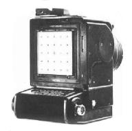 A reseau grid is used in the science of photogrammetry to establish a geometrical basis for measuring objects in photographs. It can be used to correct for any misalignment of the film in the camera, or distortions in the image after development or electronic scanning. Since the location of the marks on the reseau plate is known with great precision, correcting for distortion is a simple matter of manipulating the image until the marks are in the correct location. If you take several photographs of an object from different angles, and locate the features of that object in relation to the fiducials, and you know something about the design of the camera, you can actually reconstruct the three-dimensional geometry of the object. This is what photogrammetry tries to do. Mapmakers use photogrammetry to render aerial photographs into maps. Architects use photogrammetry to measure the features of existing buildings quickly and easily. Fig. 1 (left) shows a standard Hasselblad 500/EL Data Camera with the film magazine removed to display the reseau plate. There is a large fiducial in the center, and two rows of fiducials above and below, left and right of the center.