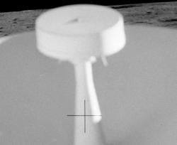 But a closer examination of the photograph reveals what's really going on. Figure 6 is a scan from the original transparency of the photo shown in Dark Moon. Here it's obvious that the camera doesn't cover the fiducial; it just makes it fainter and harder to see. Very often the JPEGs and other poor-quality versions of the photos that appear on the Internet do not faithfully reproduce such fine details. So it's easy to see why people using those sources would believe that the fiducials simply disappear.
